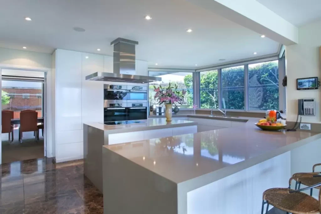 The modern kitchen serves as a focal point of the main living level, featuring a central island bench, walk-in pantry, and an industrial-sized cool room. High-end Miele appliances include integrated double ovens and grills, plus a dishwasher.
